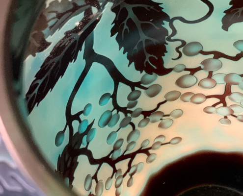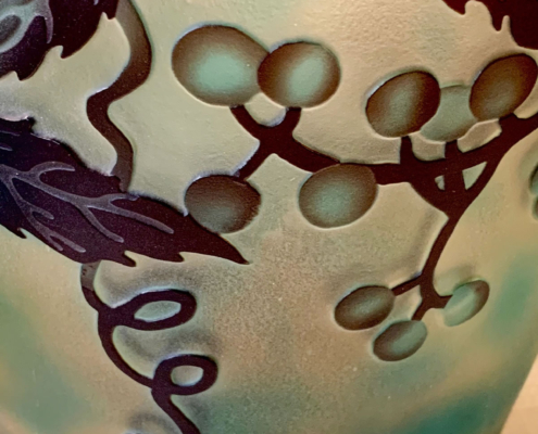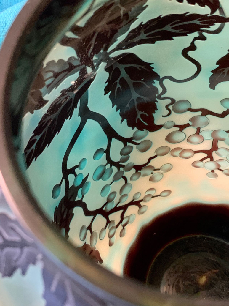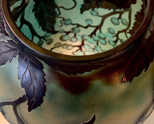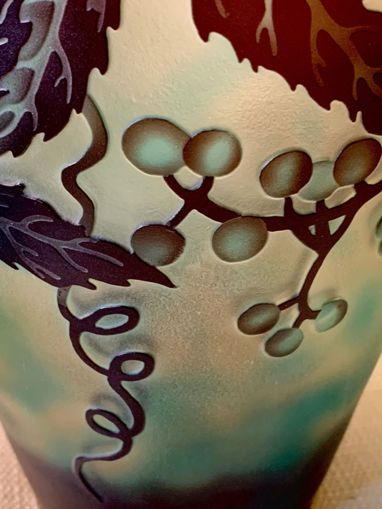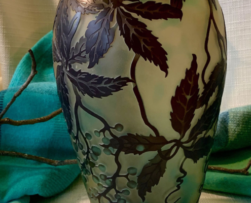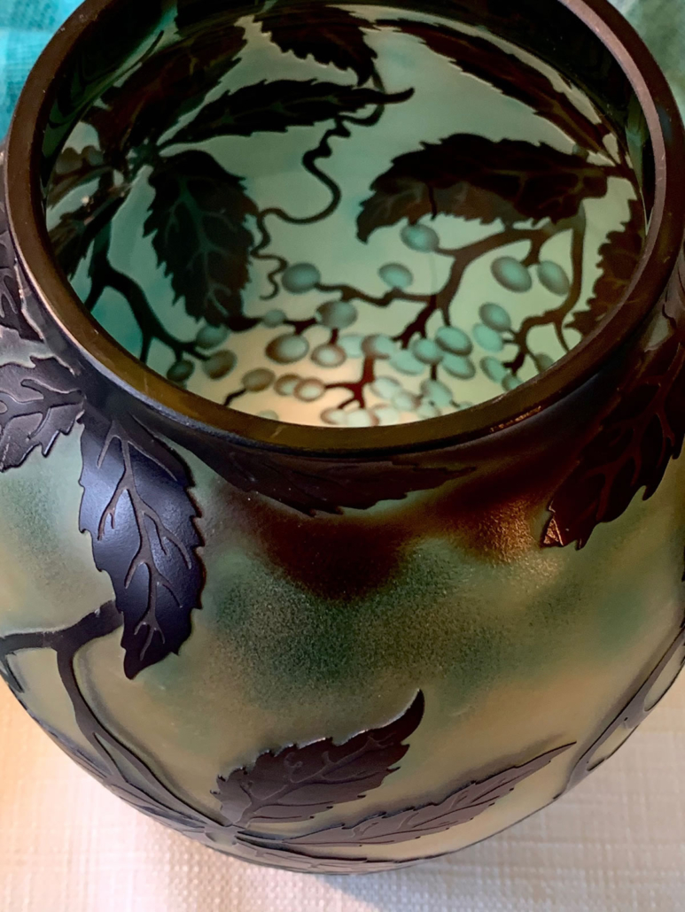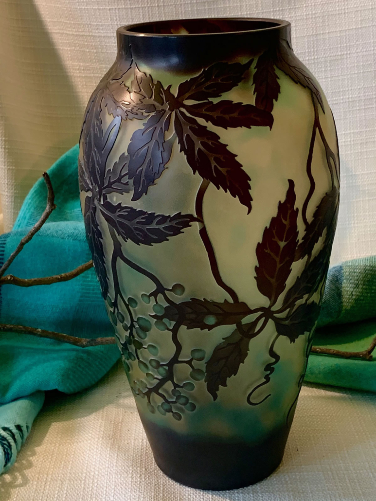 A delightful Deco vine and berry design in the style of French artist Emile Galle from the early 1900’s. Translucent muted blue green cameo glass with dark brown raised design. 13 in. tall; 7 in. diameter. $265