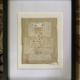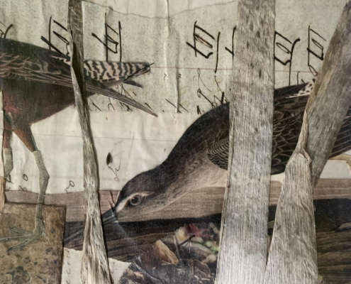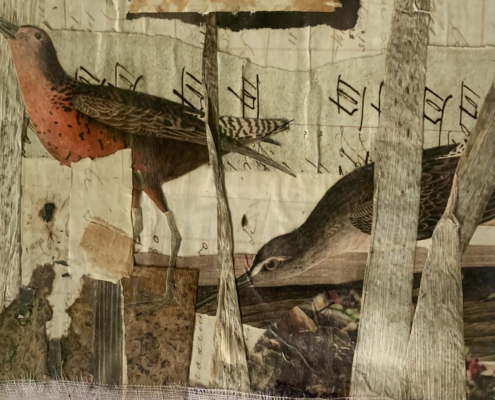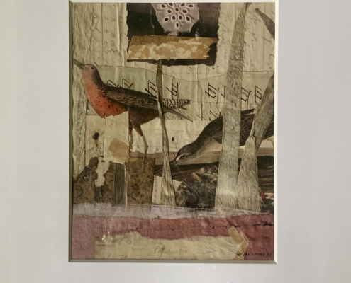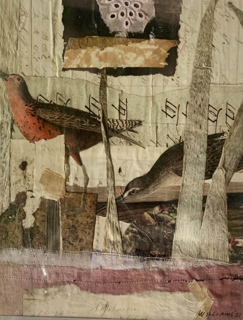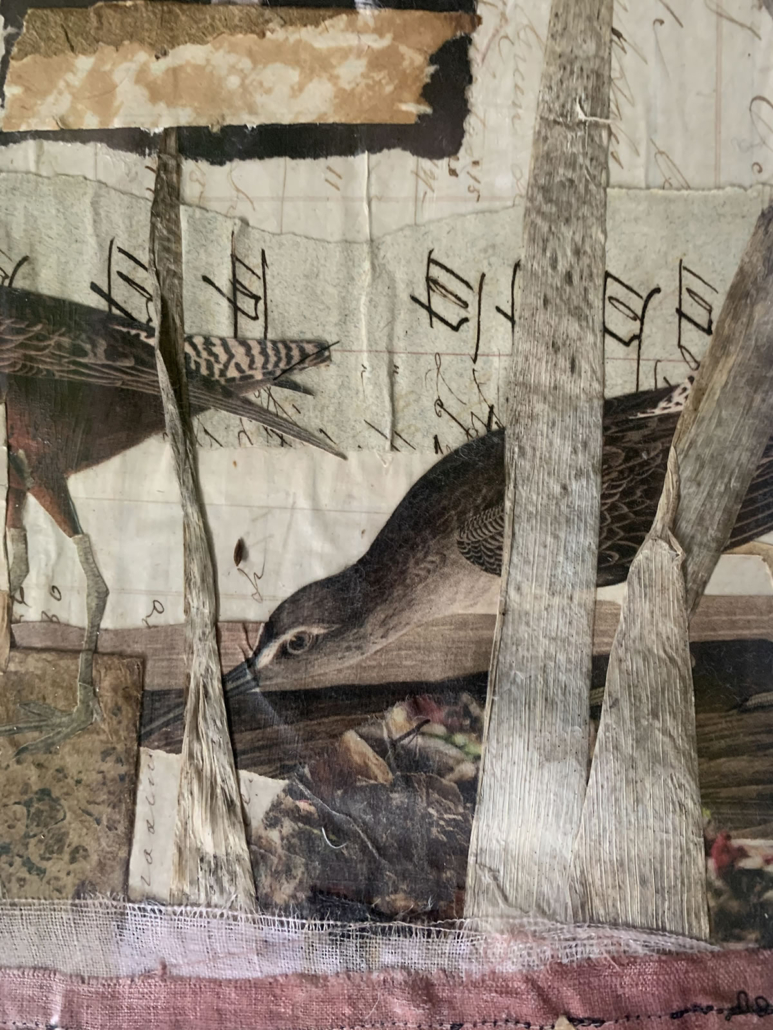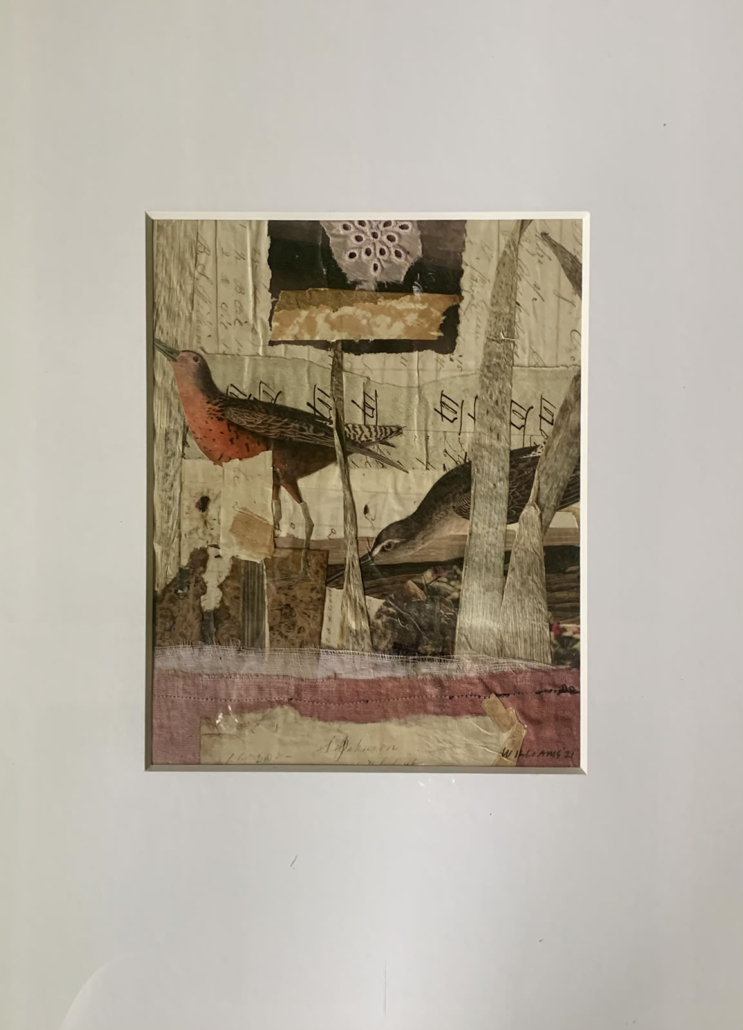 This mixed media collage was inspired first by the bird print and then by the “reeds”, actually dried iris foliage from the garden, which when pressed with an iron became perfect collage material. A combination of fabric, newspaper and vintage journals creates the background. In fact, a line of numerals when turned on its side vaguely suggests additional grasses. The overall effect has a slight oriental feel to it, and is an interesting juxtaposition of “real” and abstract. 16 x 20 in. framed. $225