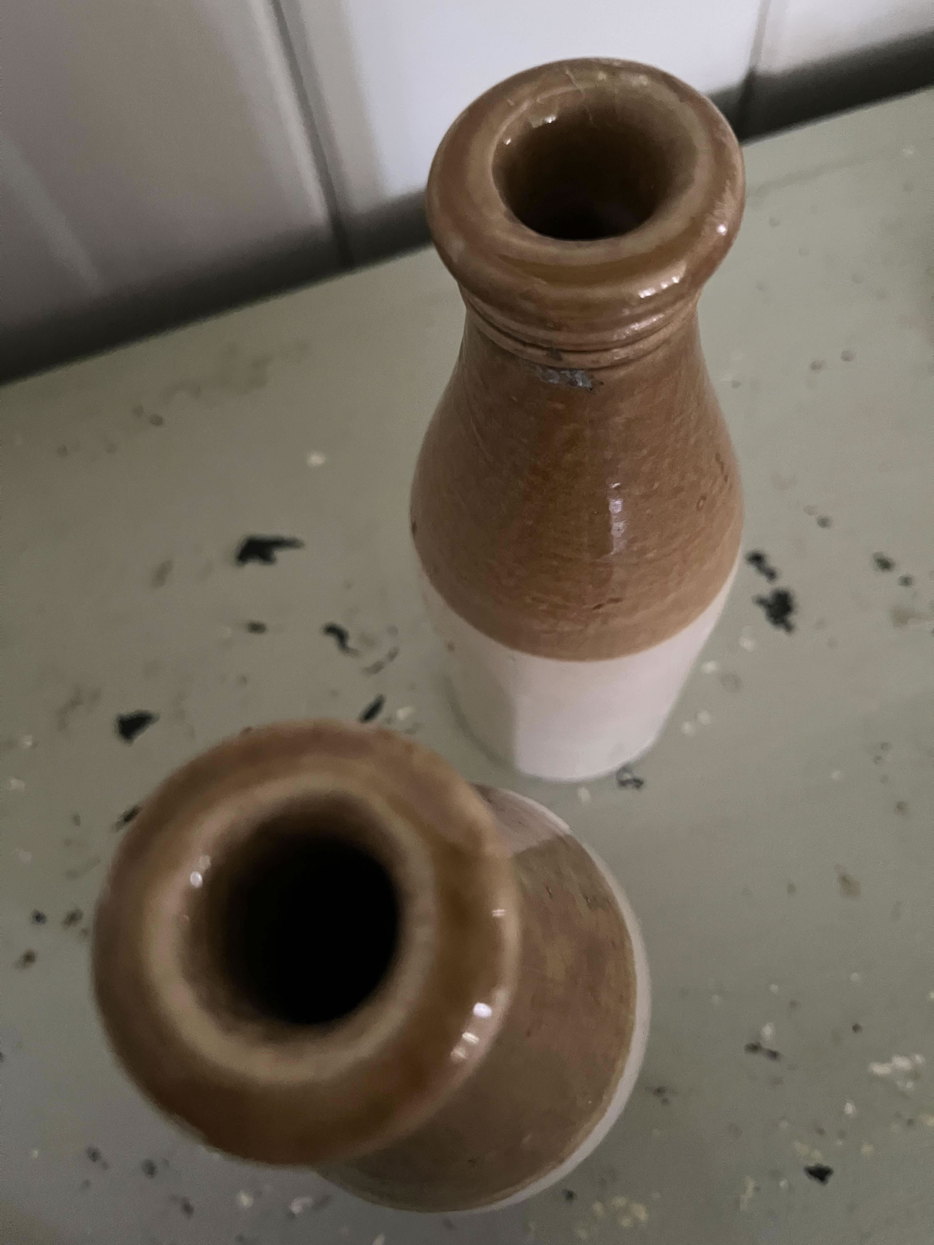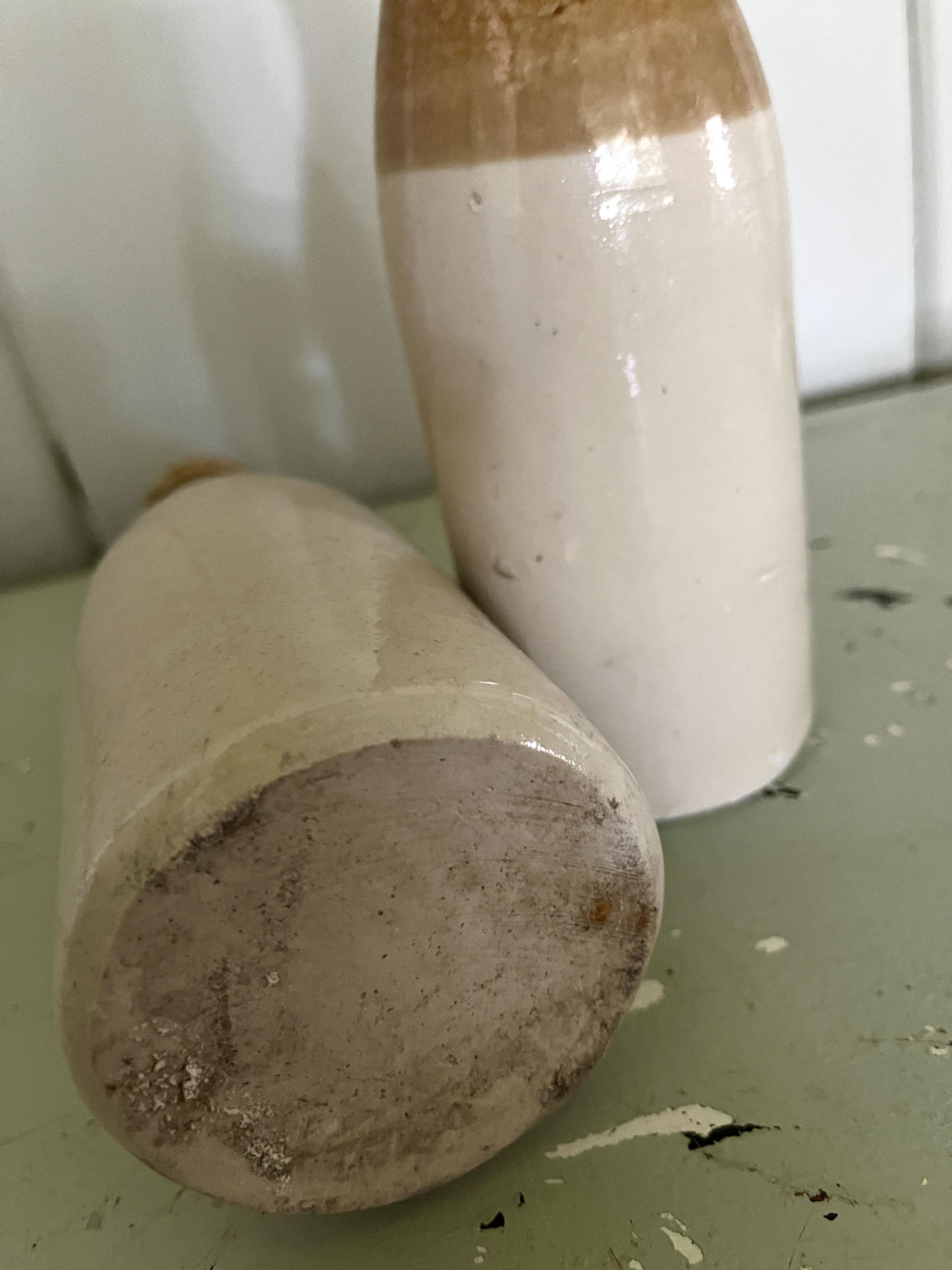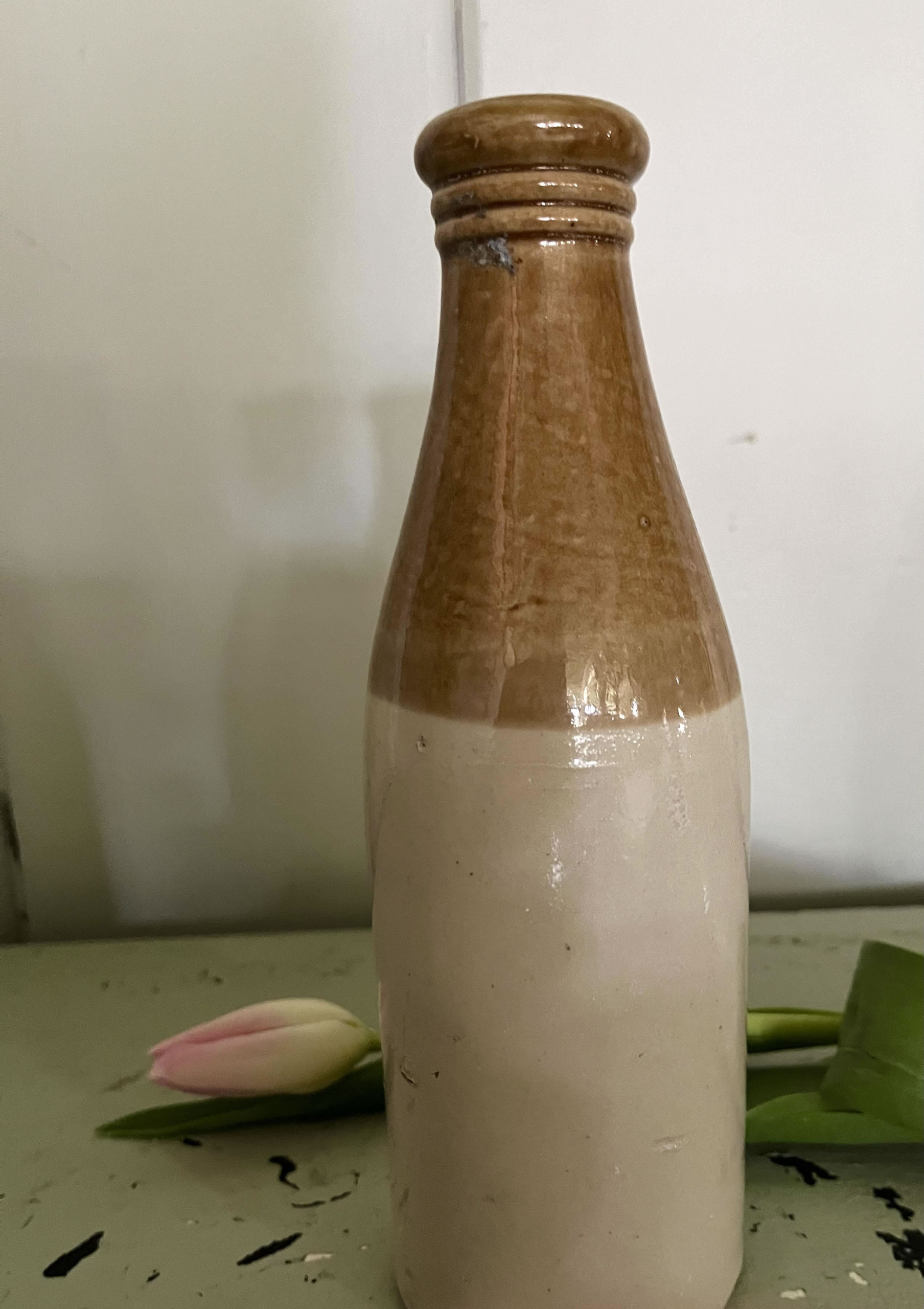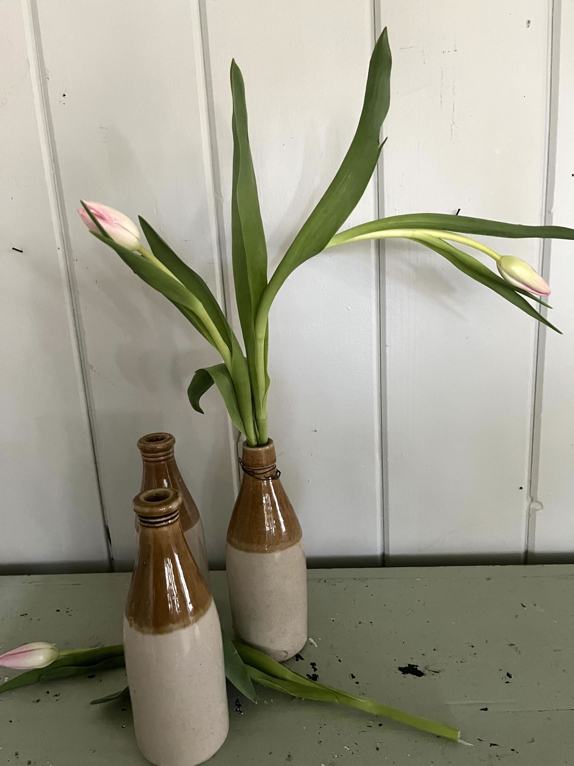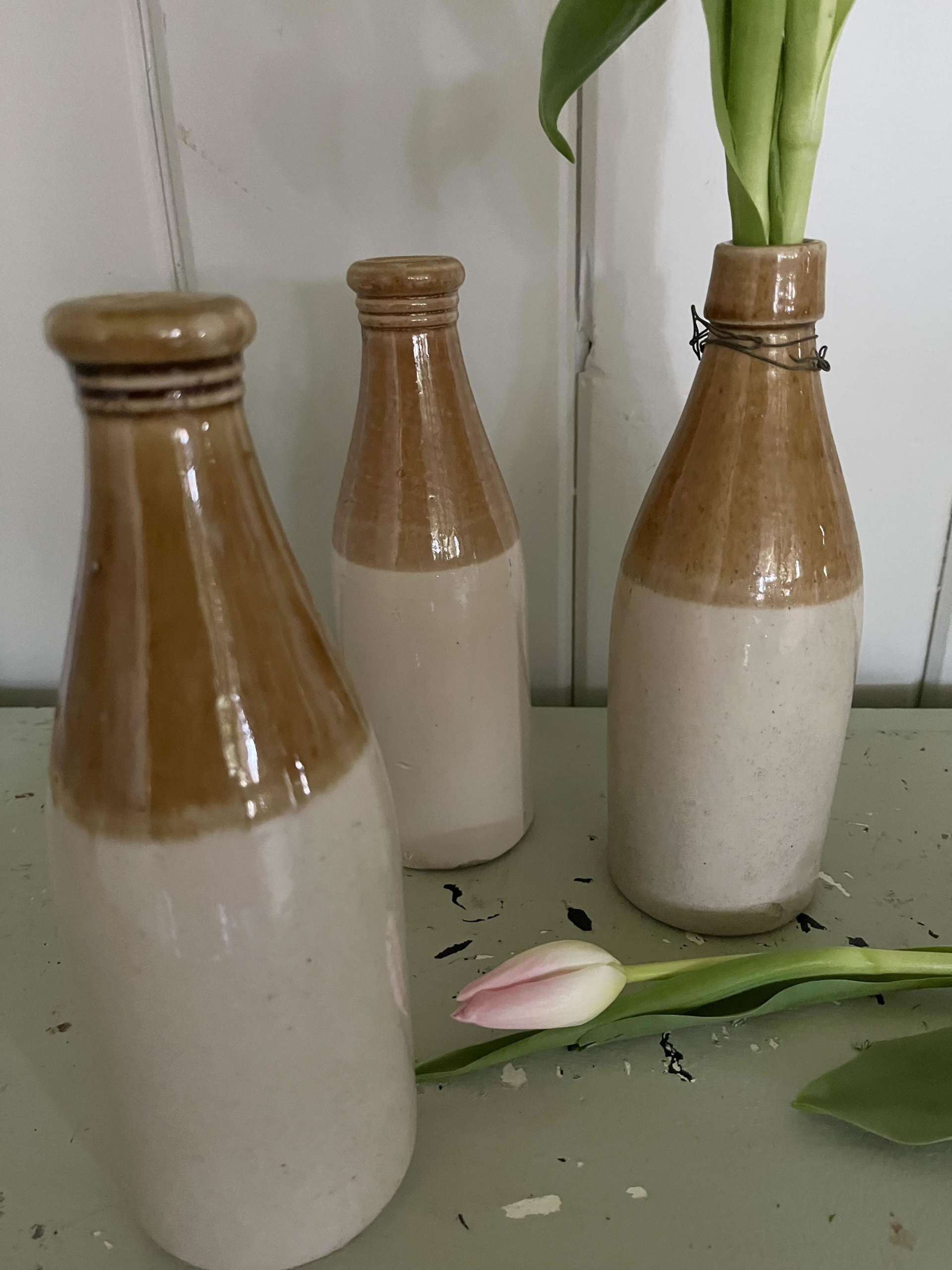 These two toned ceramic ginger beer bottles are great for a single flower or grouped en mass for an interesting country accent.