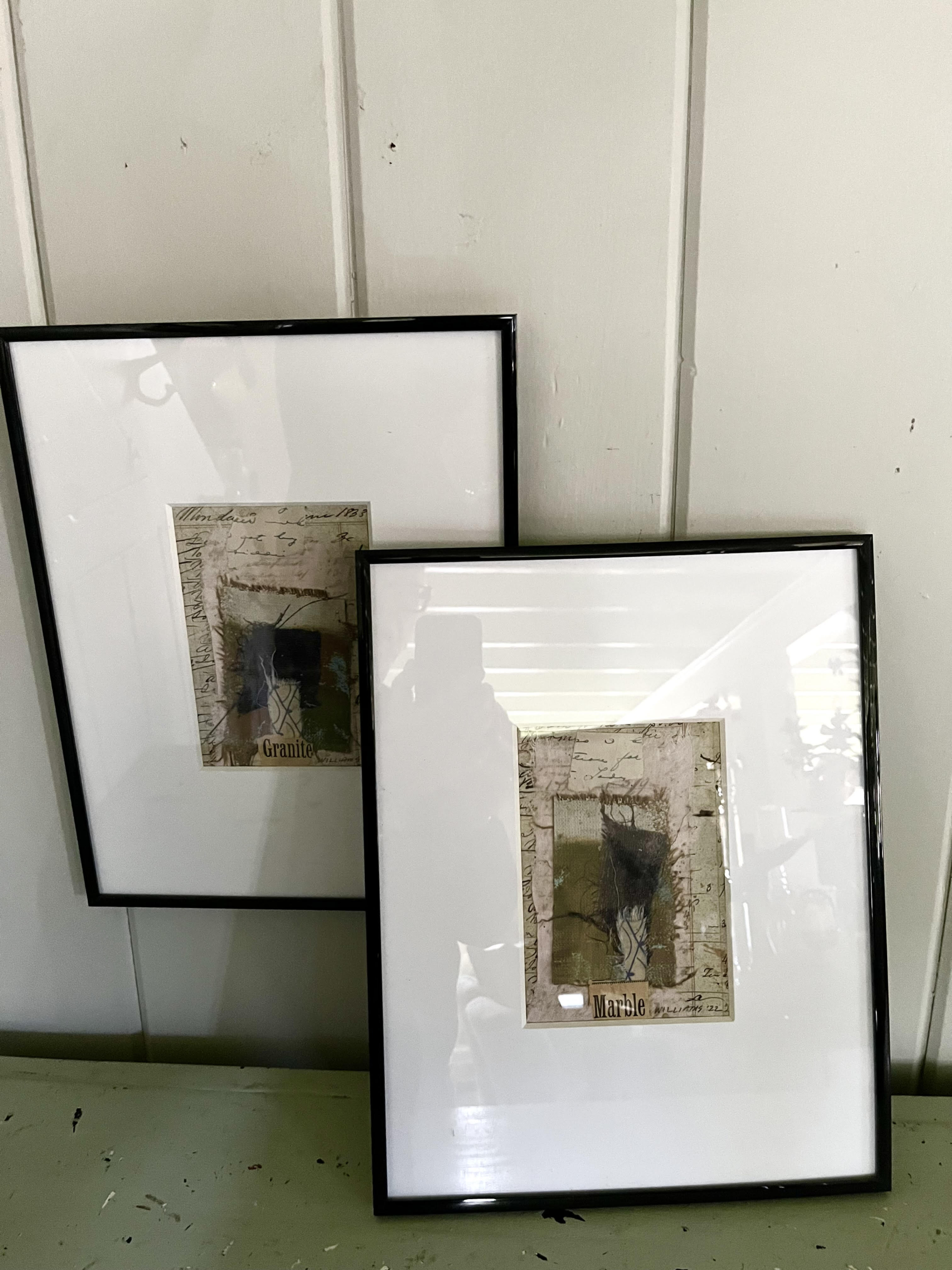 Contemporary collages by Elderberry’s Jim Williams are created from vintage ephemera, writing and fabrics that work with both modern and vintage settings. “Marble” and “Granite” are a pair of coordinating neutral textured artworks. Frame size 12 x14 inches.